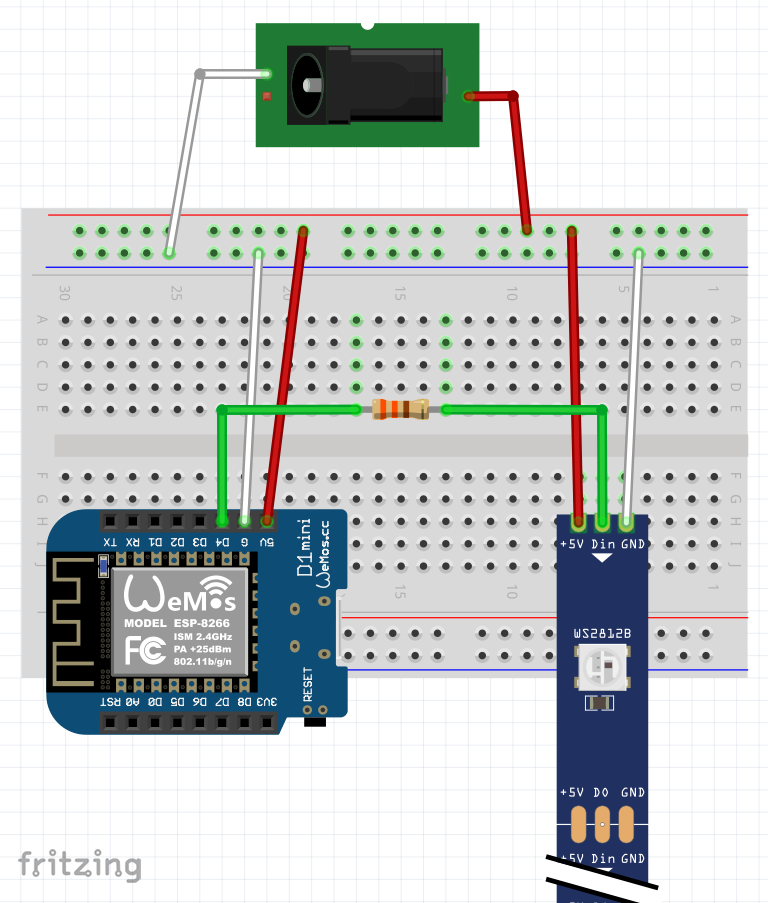 I wired a D1 Mini to the power the LED strip as shown in the schematic below but using the D1 mini’s micro-USB to power everything. If you want to drive multiple LED strips with a single D1 Mini you can wire up an external power supply to the same 5V and GND pins that the LED strip is connected to. The figures below show a barrel connector for this purpose if you decide that’s the way you want to go. If not, just ignore that component and its wiring.