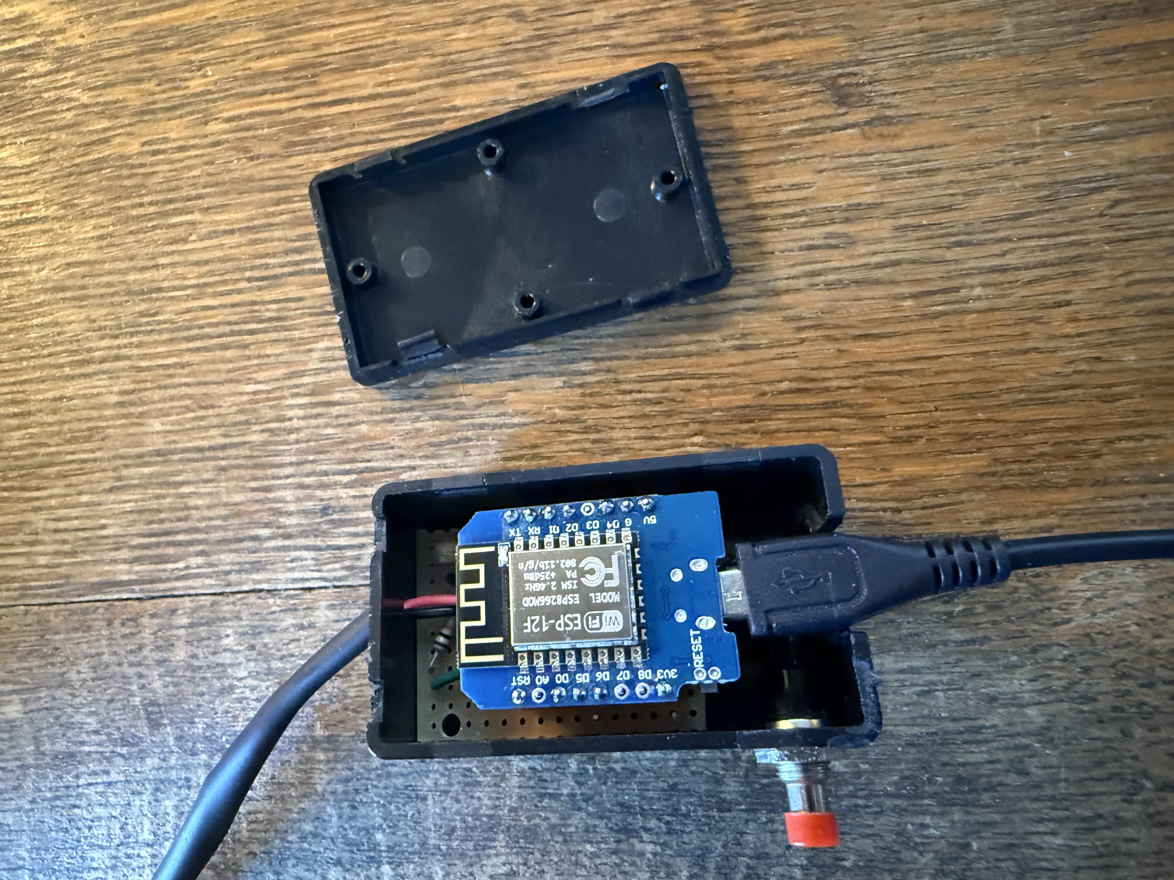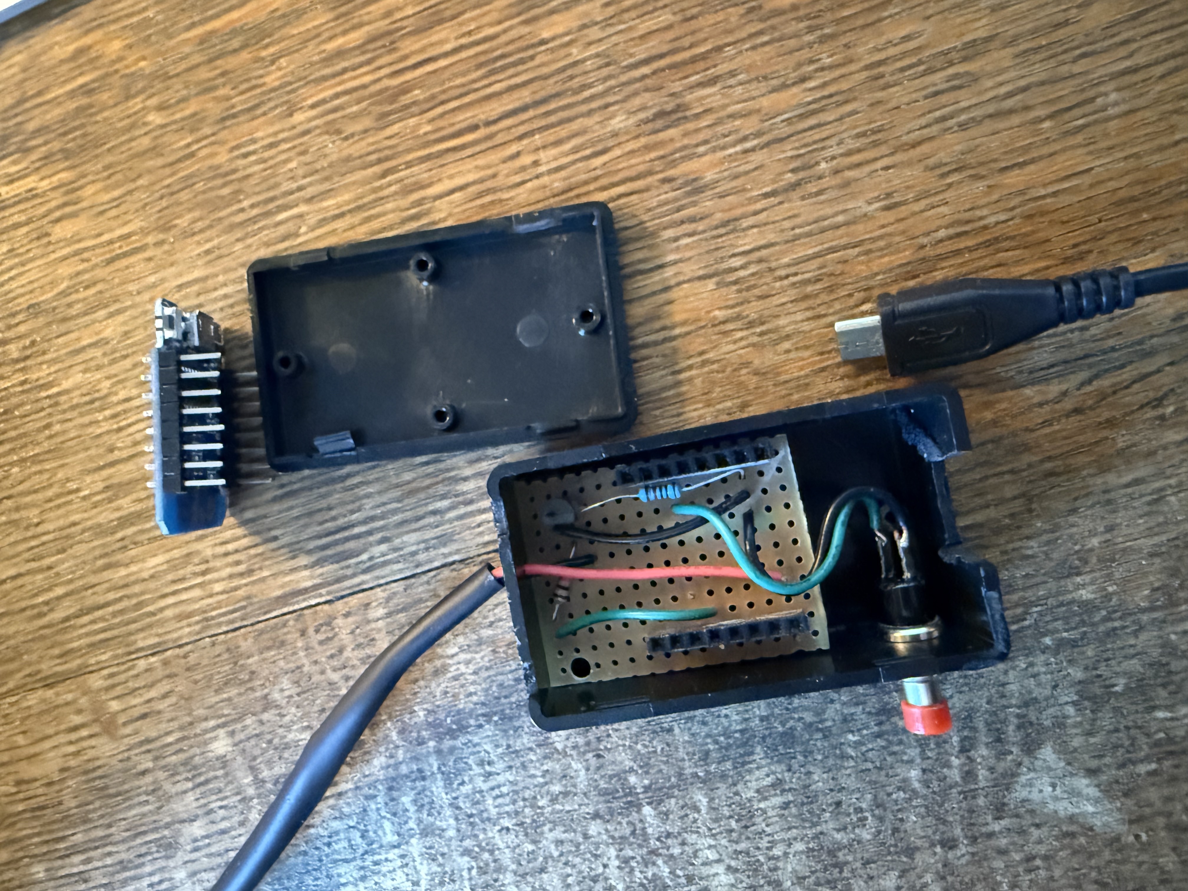 I wanted this to fit neatly into a small enclosure, so I used a 60x36x25mm project box like these. I notched one end for the micro-USB plug, drilled a small hole at the other end to run the wires to the mini LED strip, and drilled a hole in the side for the button switch.