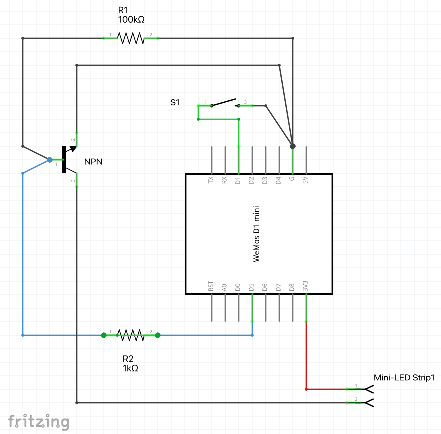 D1 mini Pin D5 ---> [1k resistor] -----> NPN Base (B)